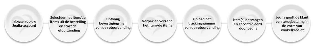 Zodra je je retourzending hebt gestart (stap 1), ontvang je binnen 48 uur een e-mail getiteld “Notification of Your Return Progress from Jeulia”. In deze e-mail ontvang je de verdere instructies voor het retourneren.